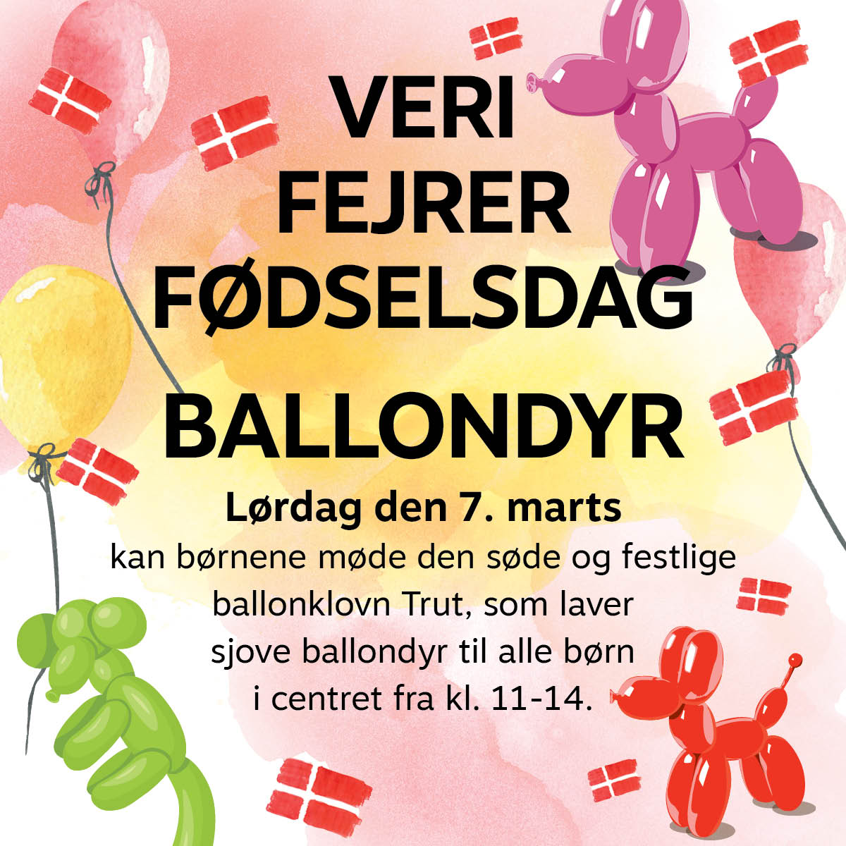 Lørdag den 7. marts kan børnene møde den søde og festlige ballonklovn Trut, som laver sjove ballondyr til alle børn i centret fra kl. 11-14. Trut laver sjov i gangene med balloner i flotte farver, som hun laver til skønne ballondyr, hatte og sværd, som børnene kan lege med. Vær med, når Trut spreder god stemning i Veri.